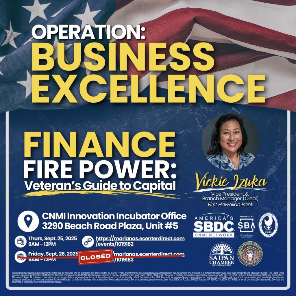 In addition to Izuka’s presentation, the CNMI SBDC team will also be offering two in-house training sessions: