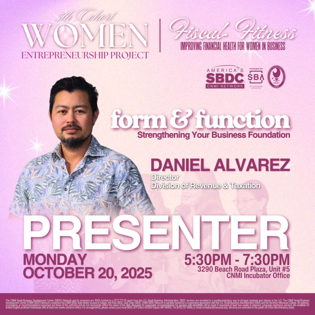 (Saipan, MP) â€“ The CNMI Small Business Development Center (SBDC) Network at Northern Marianas College is pleased to announce the Department of Revenue & Taxation (DRT), one of the CNMI’s most critical agencies when starting a business, will be joining the CNMI Department of Commerce, during its opening session of the Women’s Entrepreneurship Project (WEP) training series. The three-day series will take place from October 20 to 22, 2025 at the NMC Innovation Incubator Office located at the Beach Road Plaza commercial building in Garapan, Saipan.