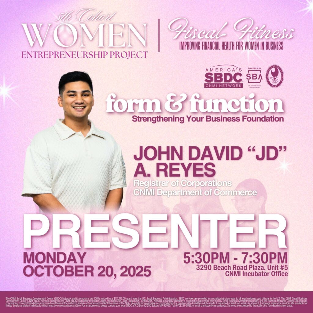 (Saipan, MP) – The CNMI Small Business Development Center (SBDC) Network at Northern Marianas College is pleased to announce the first session of its Women’s Entrepreneurship Project (WEP) training series, “Fiscal Fitness: Improving Financial Health for Women in Business.” The three-day series will take place from October 20–22 at the NMC Innovation Incubator Office located at Beach Road Plaza in Garapan, Saipan.