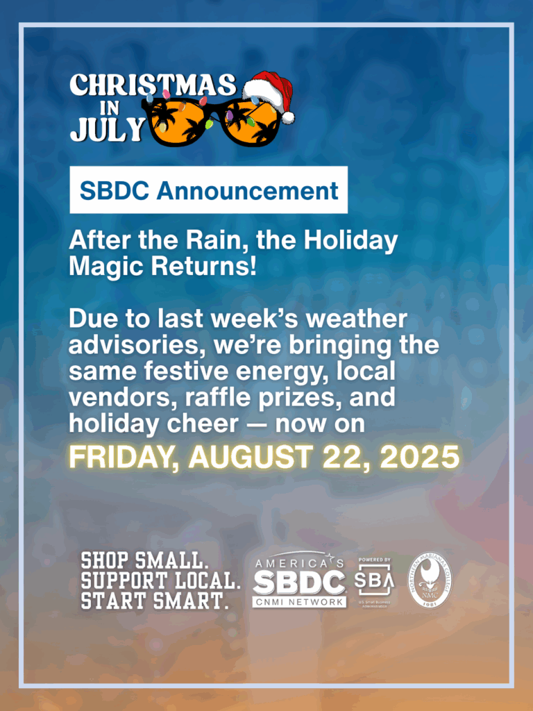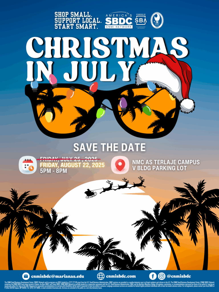 The CNMI Small Business Development Center (SBDC) Network at the Northern Marianas College is pleased to announce the new date for its Saipan Christmas in July event, now scheduled for Friday, August 22, 2025, at the Northern Marianas College As Terlaje Campus V Building parking lot.